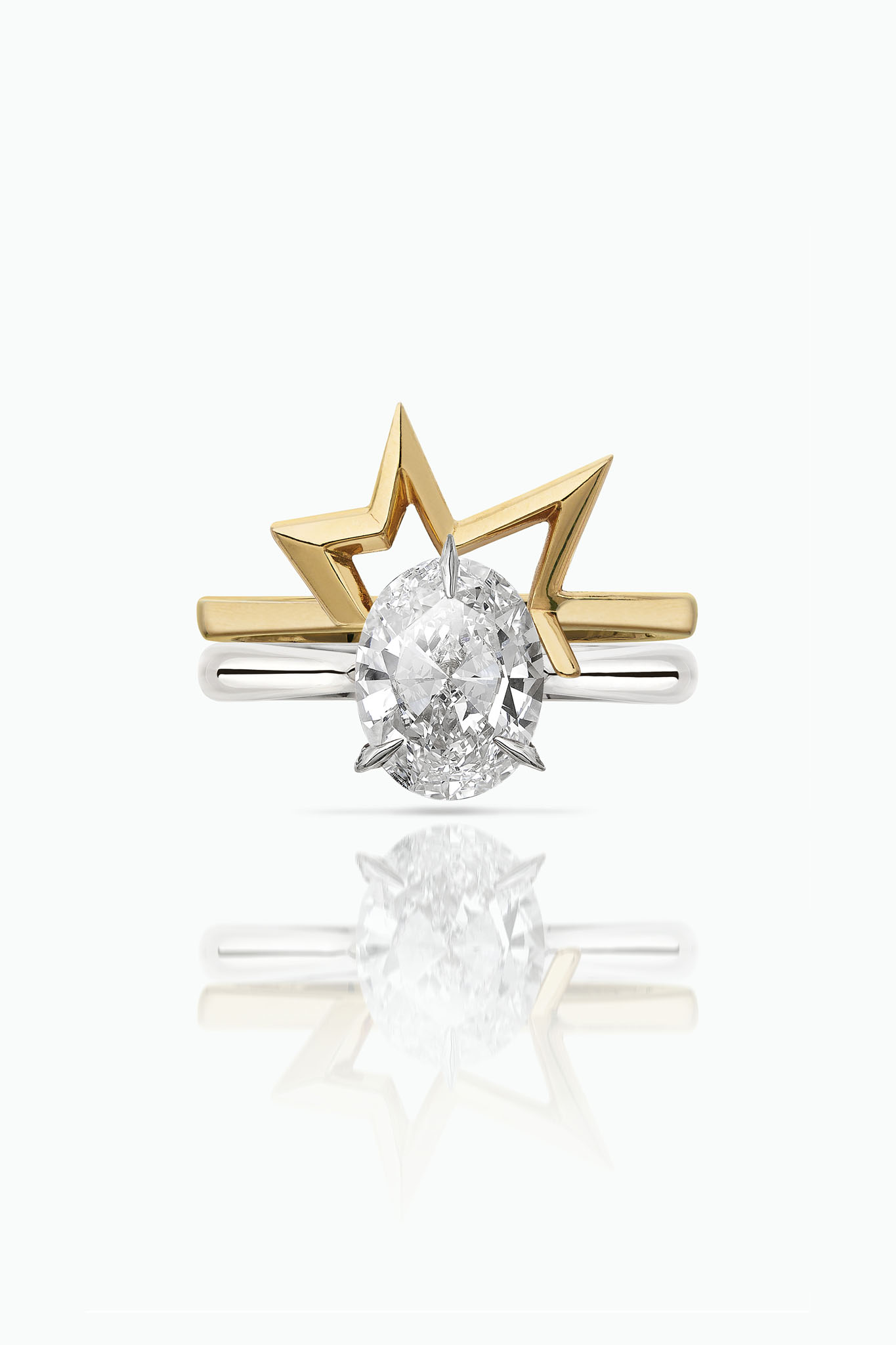 A modern alternative engagement ring and wedding band featuring a brilliant cut, lab grown, oval diamond.