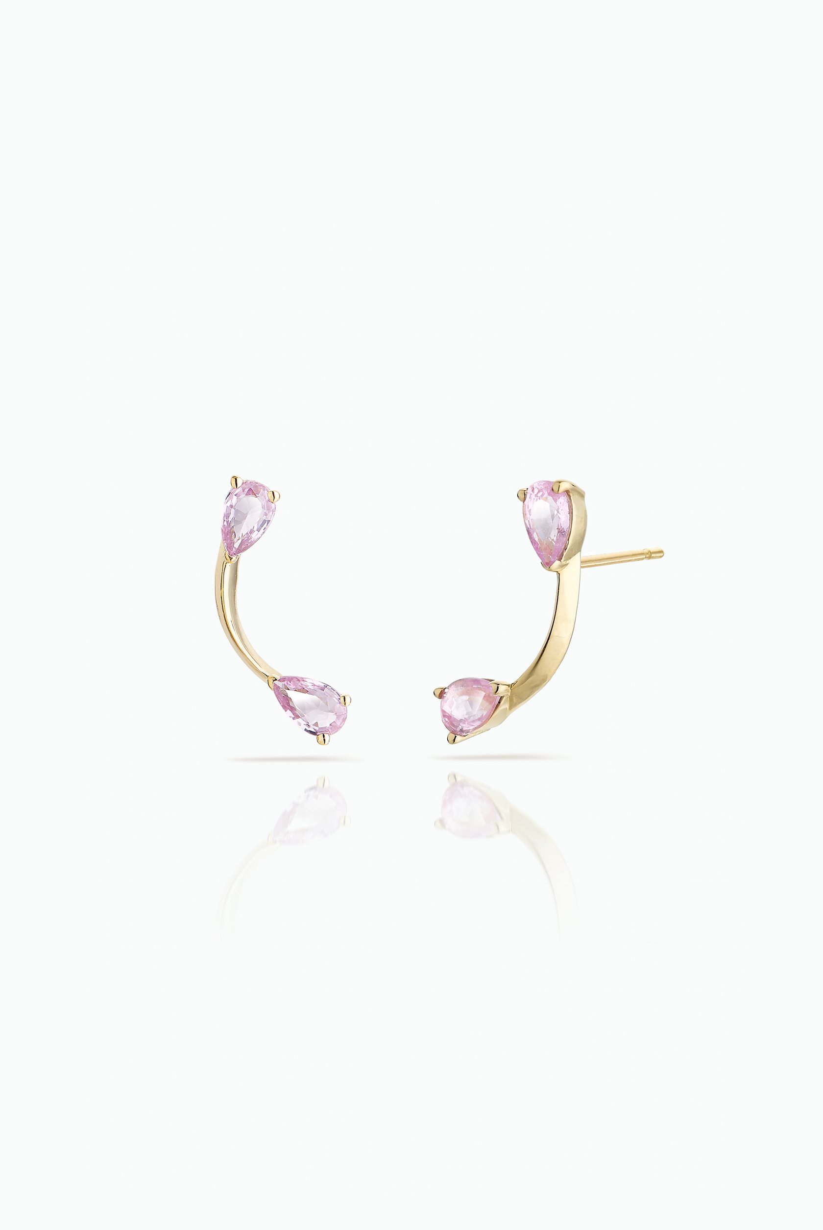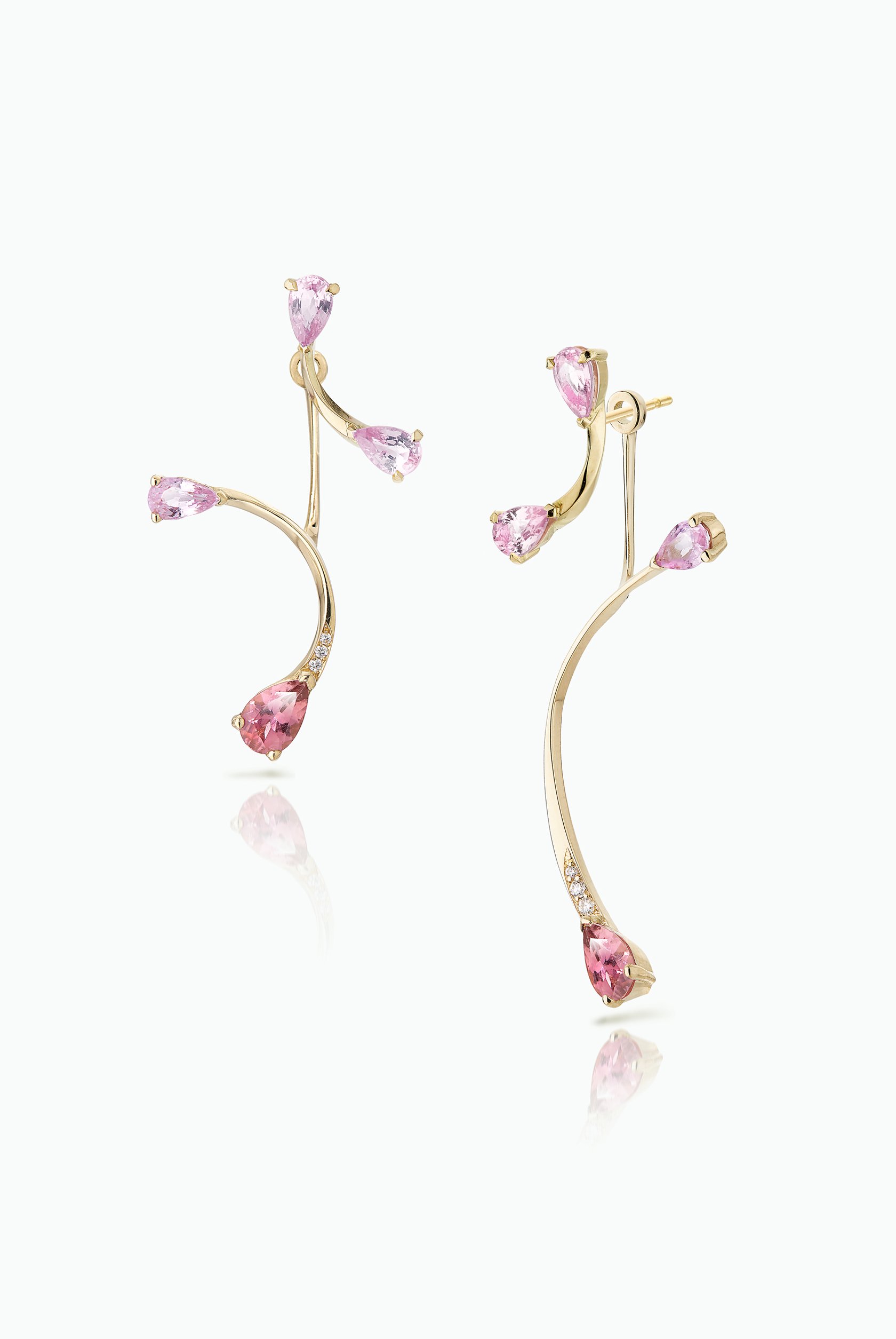A graceful flow of line that comes alive when worn. Handcrafted Ear Jackets and studs made with 18 Carat yellow gold with pear shaped Pink Sapphires, Cherry Tourmalines and Pave Set Brilliant Cut Diamonds. Ideal for those who like to mix and match their earrings and love a strong but feminine aesthetic.