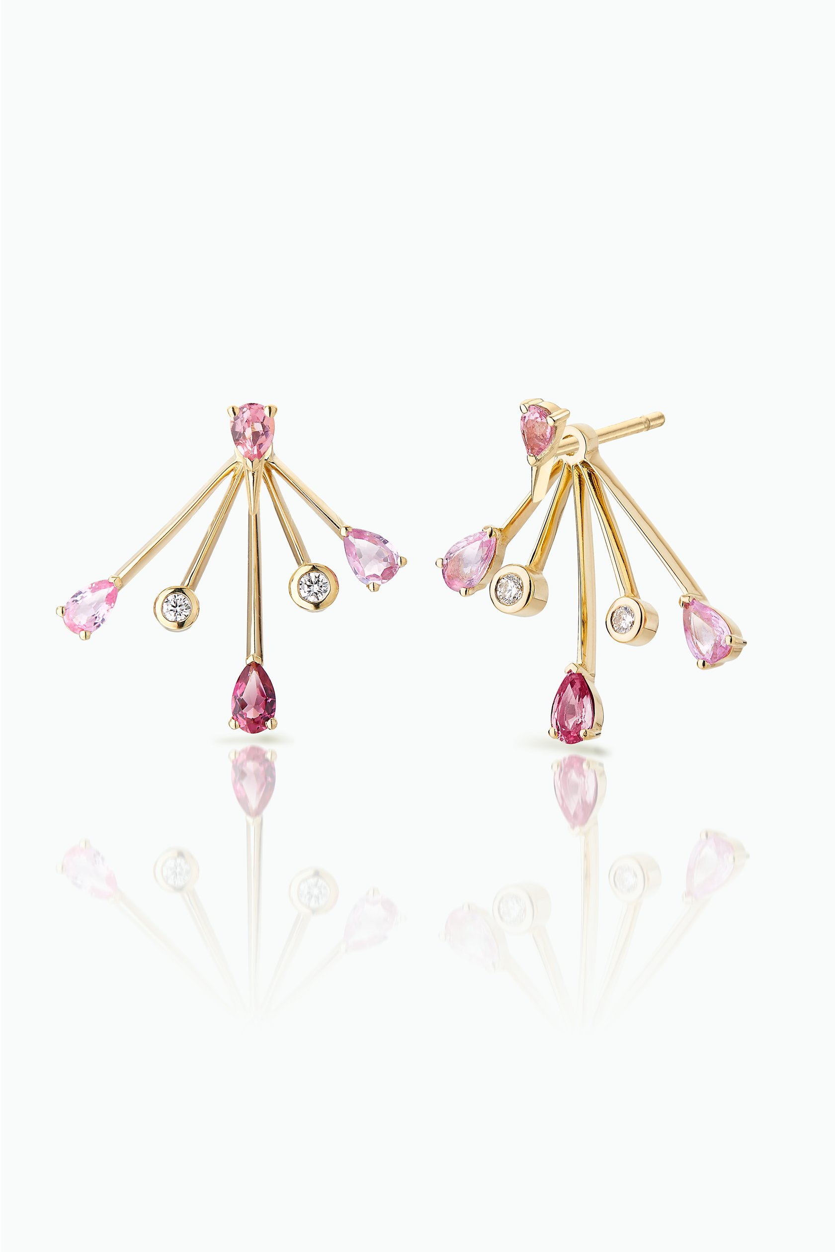 Modern, Versatile Ear Jacket and Stud. Handcrafted in 18 Carat Yellow Gold with Brilliant Cut Diamonds, Pear Shaped Pink Sapphires and Tourmalines.