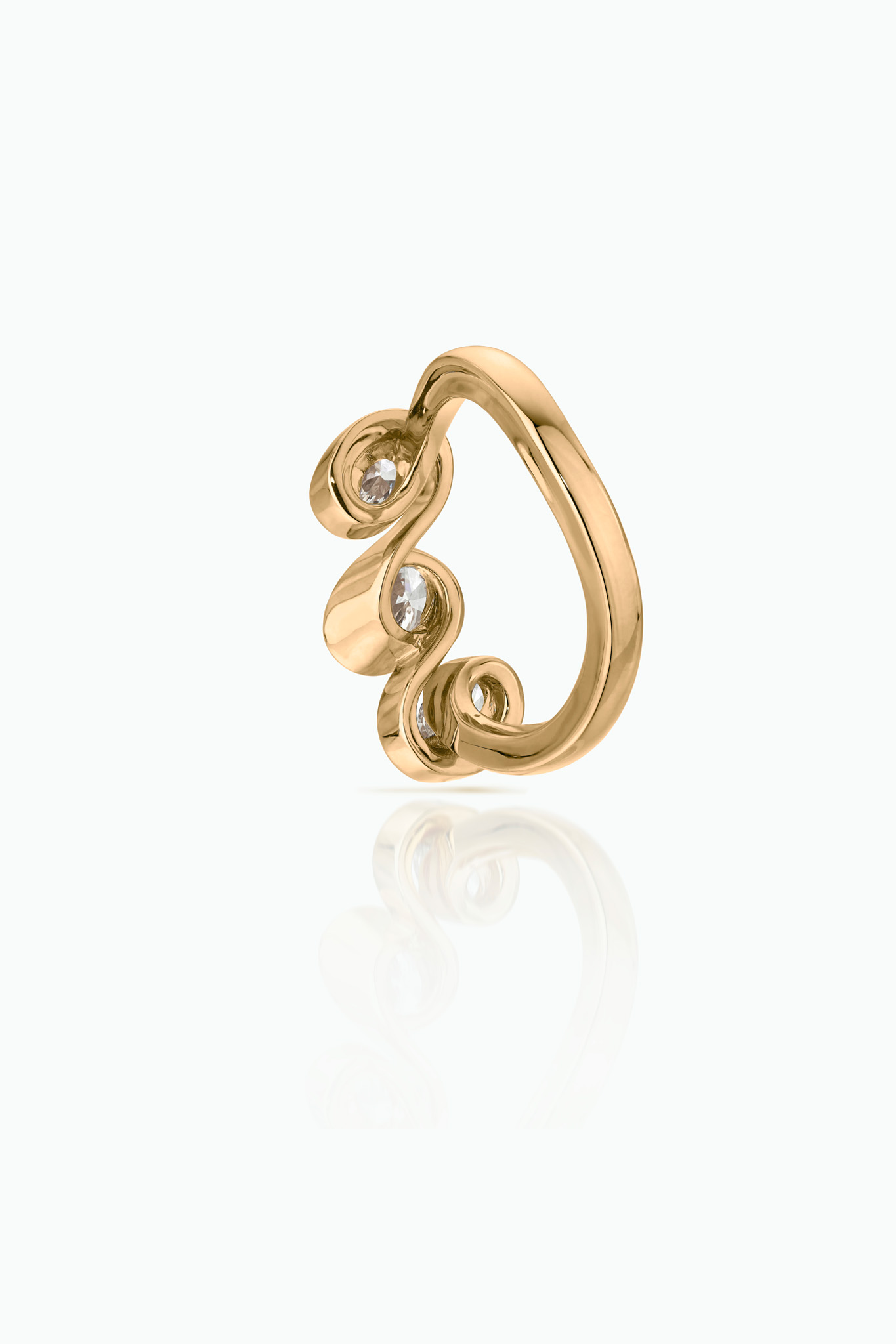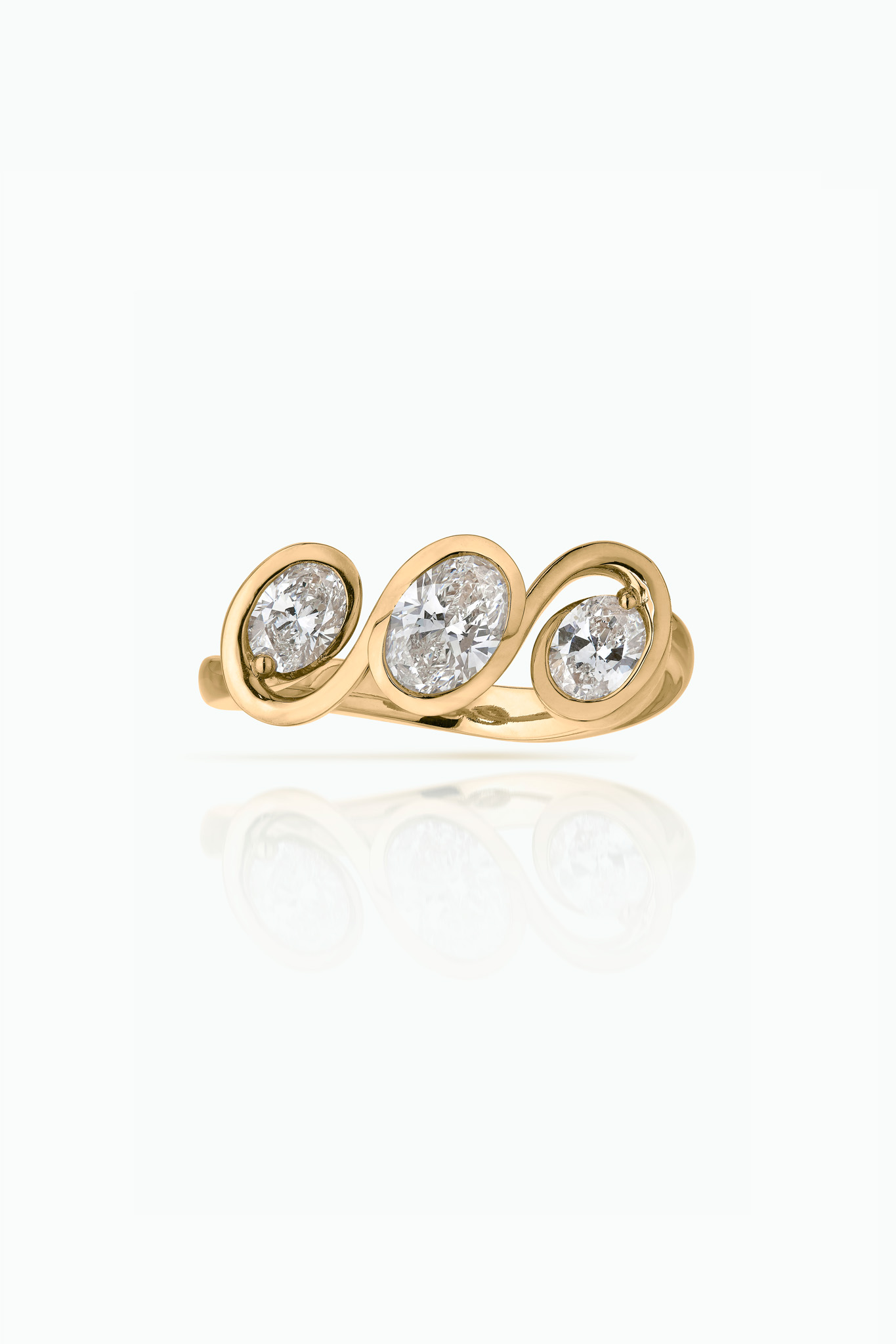 A three stone diamond engagement ring. A celebration of modern-day love and chance encounters. A continuous flowing line of gold, holds together the three perfectly brilliant cut diamonds. The design nods to the idea of an endless love with its subtle use of an neverending line.
