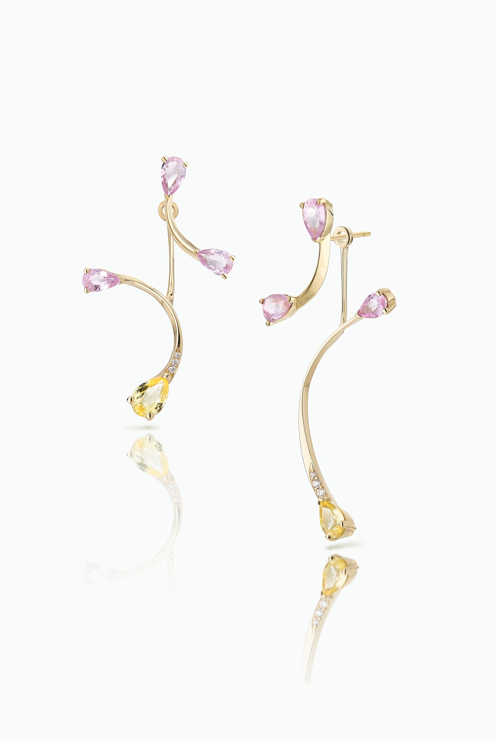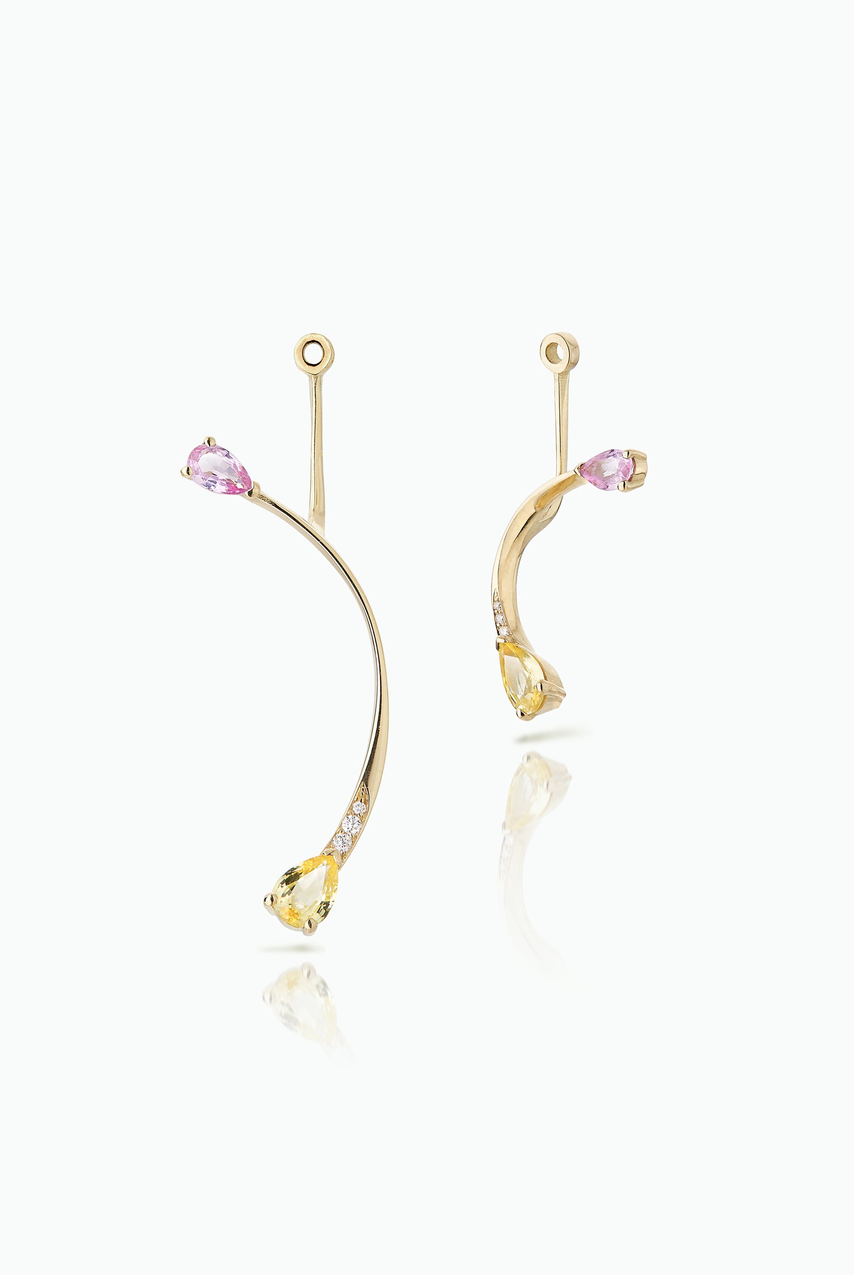 A graceful flow of line that comes alive when worn. Handcrafted Ear Jackets made with 18 Carat yellow gold with pear shaped Pink and Yellow Sapphires and Pave Set Brilliant Cut Diamonds. Ideal for those who like to mix and match their earrings and love a strong but feminine aesthetic.